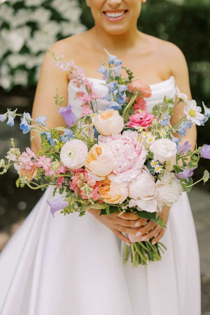 Country Blooms designed a summer wedding color palette that softened the venue’s industrial ballroom feel and set the tone for the rest of the day. These colorful bouquets leaned fully into Brenna and Fran’s bright, happy vision!