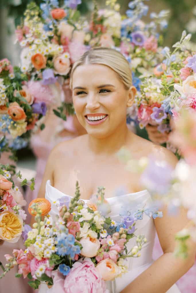 | Color Palette | Colorful florals + mismatched blush pink bridesmaid dresses |